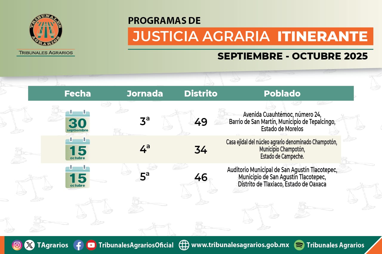PRINCIPAL WP Buscar: | | | | ‹ › LO ÚLTIMO PUBLICADO EN REDES SOCIALES Tribunales Agrarios DÍA NARANJA JUSTICIA ITINERANTE VIERNES DE DERECHO AGRARIO VISITAS DE INSPECCIÓN OTROS ENLACES DE INTERÉS REGLAMENTO INTERIOR DE LOS TRIBUNALES AGRARIOS 2024 CONSULTA AQUÍ TU RECIBO DE NÓMINA ✅ INFORME DE LABORES 2024 SERVICIO SOCIAL Y PRÁCTICAS PROFESIONALES DOCUMENTOS DE DESCARGA ACUERDOS DE SUSPENSIÓN DE ACTIVIDADES EN LOS TUAS XXII REUNIÓN NACIONAL DE MAGISTRATURAS DE LOS T.A. QUEJAS Y DENUNCIAS